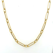 This 14K yellow gold paperclip chain is a bold statement piece. The interplay of small and large links, with the latter showcasing intricate faceted details, creates a captivating and eye-catching design.
